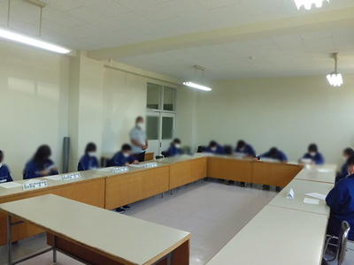 生徒会役員を中心に「絆づくりメッセージ」の取組を行いました。生徒会役員から各学級へ「絆づくりメッセージ」をつくる提案がされました。その後各学級でリーダーから「日常の学校生活を振り返るとともにいじめ防止そしてSNSの問題を考える機会として取り組もう。」と訴えがありました。自分達の生活を自分達で磨きをかけ創り上げていこうとする枝中生素敵です。(左の写真は生徒会役員が提案している場面。右の写真は学級で一人ひとりが考えている場面。)